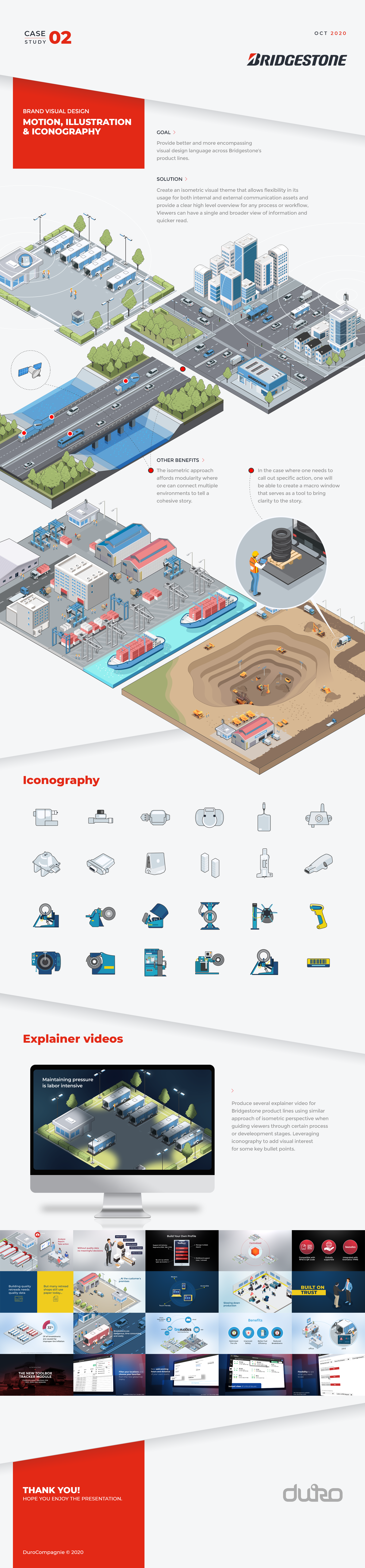 Bridgestone hires Duro via Toptal to help streamline and create a cohesive visual design language that encompasses their internal and external marketing assets from presentation deck to explainer videos.